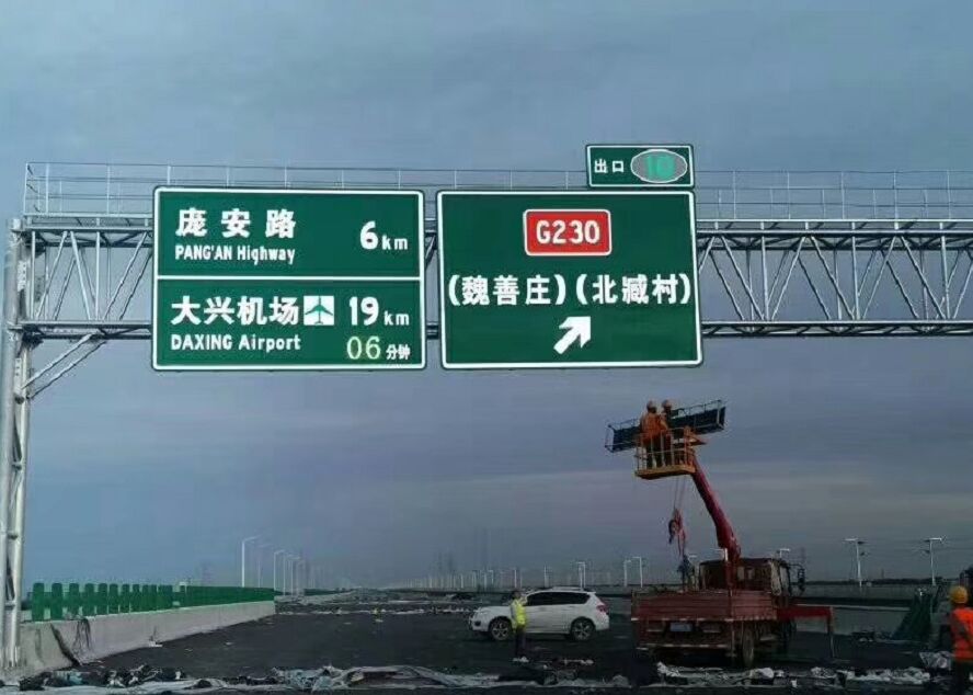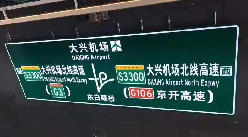 北京大興國際場外圍道路已重新規(guī)劃布局,相應道路拖延延伸,路徑指引標志系統(tǒng)采用最先進的LED主動發(fā)光交通標志,標志實現(xiàn)時空同步,同一塊標志中既顯示到達大興機場距離,又讀取高德通行數(shù)據(jù),測算出平均車速,給出達到大興機場的時間,方便駕駛?cè)藛T有效規(guī)劃路徑、全天候視認標志版面,目前已全部完工、交付。
