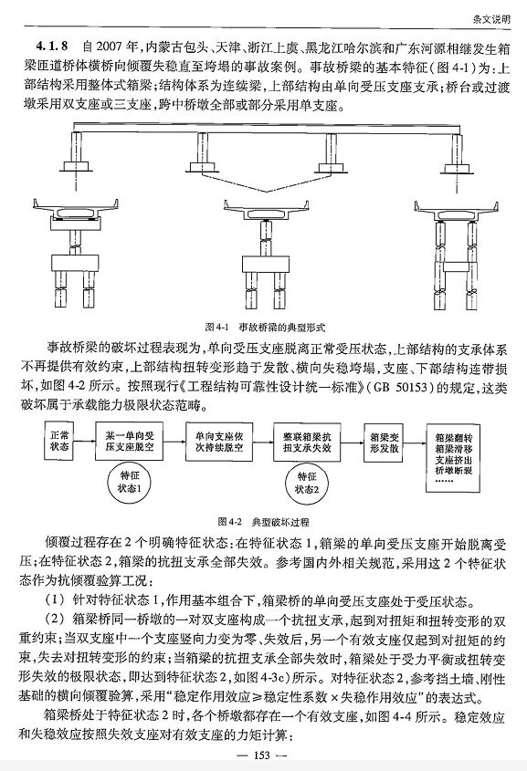據(jù)專業(yè)標準了解,該處橋梁上部結(jié)構(gòu)采用整體式箱梁;結(jié)構(gòu)體系為連續(xù)梁,上部結(jié)構(gòu)由單向受壓支座體系;橋臺或過渡墩采用雙支座或三支座,跨中橋墩全部或部分采用單支座。該類型橋梁易被破壞的表現(xiàn)為:單向受壓支座脫離正常受壓狀態(tài),上部結(jié)構(gòu)的支承體系不再提供有效約束,上部結(jié)構(gòu)扭轉(zhuǎn)變形趨于發(fā)散、橫向失穩(wěn)垮塌,支座、下部結(jié)構(gòu)連帶損壞。參見行標《公路鋼筋混凝土及預應力 混凝土橋涵設計規(guī)范》(JTG 3362-2018)。