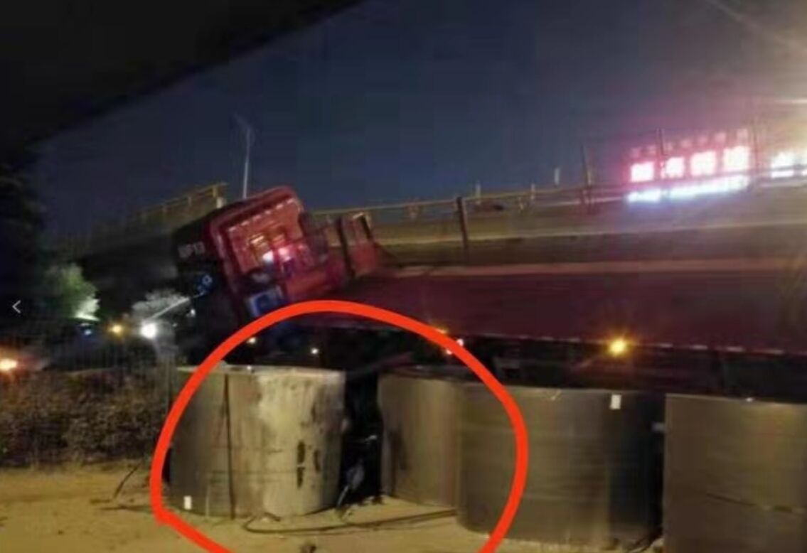 據(jù)了解,事故發(fā)生時,通過的貨車嚴重超載,承載了6套熱軋卷板,每套重量約28535kg,算一算,貨品總重:28.535噸/卷*6卷=171.210噸。再加上貨車自重,整體重量約190噸。該貨車通行時,行駛路徑為側(cè)邊行走,然后高架橋面?zhèn)确恕?/p>