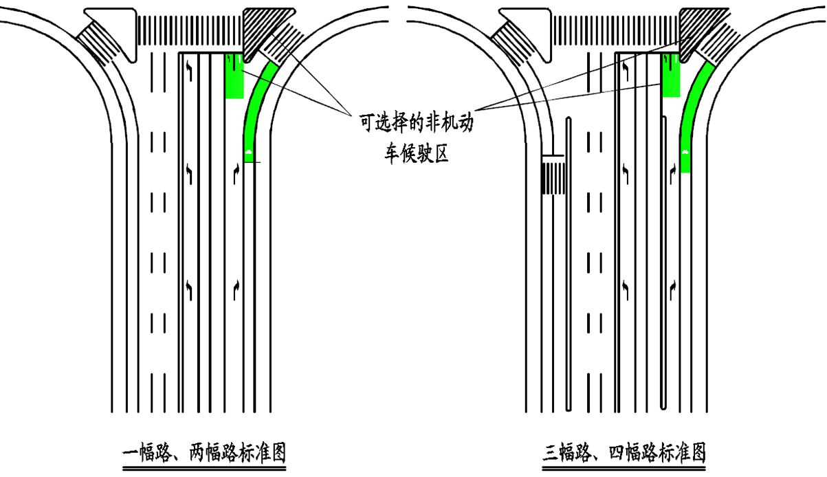 (2)三環(huán)外及三環(huán)內(nèi)特殊路段:因大型貨車、客車通行需求較多,對(duì)車道寬度要求較高時(shí),可對(duì)交叉口進(jìn)口車道寬度適當(dāng)進(jìn)行增加;