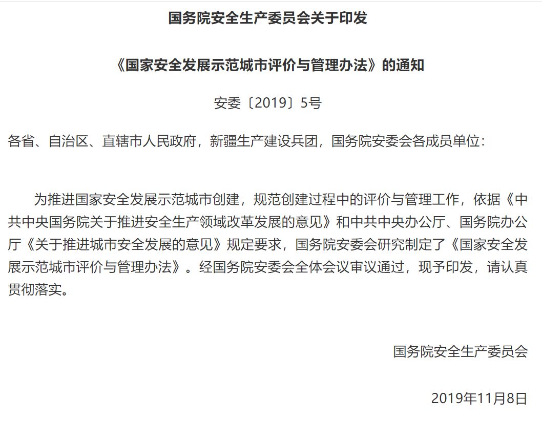 為推進國家安全發(fā)展示范城市創(chuàng)建,規(guī)范創(chuàng)建過程中的評價與管理工作,11月8日,國務院安全生產(chǎn)委員會,向各省、自治區(qū)、直轄市人民政府,新疆生產(chǎn)建設兵團,國務院安委會各成員單位印發(fā)了《國家安全發(fā)展示范城市評價與管理辦法》(以下簡稱“評價辦法”)的通知。