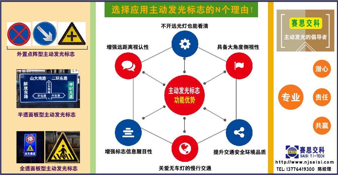 道路交通安全及管理設(shè)施(以下簡稱“交通設(shè)施”),是展示道路交通、道路安全、道路管理指令等信息的重要載體,其在應(yīng)用技術(shù)上的創(chuàng)新,直接彰顯著道路設(shè)計者、道路管理者的綜合水平。南京賽思交通信息科技有限公司主要從事主動發(fā)光標(biāo)志、智能交通安全設(shè)施等研發(fā)、生產(chǎn)、銷售。