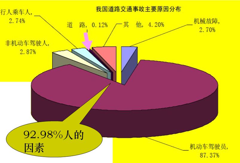 海因里希用多米諾骨牌來形象地描述事故因果的連鎖關(guān)系:在多米諾骨牌系列中,一只骨牌被碰倒了,其余的骨牌將相續(xù)按波的方向被碰到,如果移去其中一只骨牌,則連鎖反應(yīng)被破壞,事故被終止。他的理論人為,防止人的不安全行為,消除非人為因素的不安全狀態(tài),以此中斷事故連鎖進(jìn)程,從而規(guī)避事故發(fā)生。根據(jù)《墨菲定律》的描述,交通要素中一旦有設(shè)計(jì)缺陷存在,發(fā)生事故是時(shí)間累計(jì)后的必然結(jié)果。由于遺傳因素、身體因素、心理因素等多重作用,會(huì)對人的判斷力、行動(dòng)力產(chǎn)生影響,在調(diào)取大量事故資料研究后發(fā)現(xiàn),導(dǎo)致事故發(fā)生的直接原因中,人為因素的影響占據(jù)很大一部分。